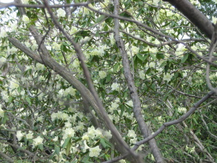 御所山の山頂は、一筋の切り開きの道が通っているだけであった。アセビの枝先の新葉は、まだ開きかけたばかり。ネジキの若葉も、まだ十分には広がらずに、その裏表に銀色の毛が光っていた。