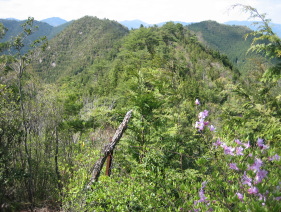 御所山から、さらに尾根道を南へ進んだ。木が疎らになったところでは、西に大中山が大きく、その左に七種の山々が望めた。ところどころに、角のとれた岩が飛び出している。花こう岩がつくる地形らしくなってきた。
