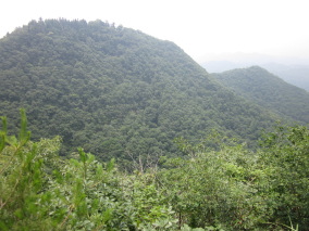 ダムの左岸を回り込むと、山道が小さな渓流に沿ってついていた。あたりはしっとりと湿り、ドクダミの白い花が暗い林内に際立っていた。 道は、左岸から右岸へと渡り、やがて渓流から離れて、水音も小さくなった。道の両側からリョウブやクロモジの枝葉が張り出してきた。 足元の葉の裏から、うす茶色の蛾が次々と飛び立ち、ホタルガが林内を漂った。 クモの巣を払いながら、湿気に蒸す山道を登った。道は岩がちとなった。ときどき、木漏れ日が林内に差し込み、岩の上のコケを明るく照らした。木の上からは、オオルリの澄んださえずりが聞こえていた。 道の傾斜はしだいに大きくなり、ロープをつかんで登ると峠に達した。四方から山道の集まった峠は、風がよく通った。 ここから西へ、宰相ヶ岳に向かった。ヤブツバキやシキミの間を、はっきりした小道が真っ直ぐに上っていた。 ひと登りすると道は平坦になり、少し下ったと思うと再び急な上りとなった。標高差50mを一気に登り詰めると、宰相ヶ岳の山頂に達した。 山頂は、三角点の周りが小さく伐り開かれ、その周りをコナラやクリの雑木が囲んでいた。山頂を少し通り越したところに、展望のよい岩場があった。南東に、羽束山が壁のように立って迫っていた。羽束山はすぐそこなのに、その山肌は濃い水蒸気に白くかすんでいた。羽束山の右に布見ヶ岳や大岩山がくすみ、その奥に大峰山がさらに薄くなって重なっていた。イワツバメが山頂をかすめ、トビが風に乗って空高く舞い上がった。