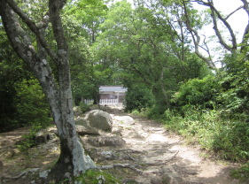 ひと休みしたあと、広場から手すりロープに沿って南に進むと、地面に大きな岩が広がっていた。岩の先に立つと、目の前に大きく展望が広がった。 眼下には、依然として白くかすんだ丘陵が小さな山々を乗せて横たわっていた。遠くには、六甲の山脈が薄い青みを帯びた山影となって稜線を広げ、その上には夏雲が湧き始めていた。 道はここで消え、立ち入り禁止の看板もあったので、神社に戻って、その脇から下った。