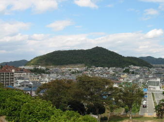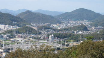 | 神子岡山(中央)と名古山(手前に細長く伸びる丘陵) |