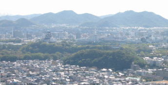 外堀の茂みに方形に縁取られ、姫路城天守閣をのせているのが姫山。その手前には、姫山と対をなすように男山が小さく突き出している。男山の右の景福寺山は、長円形の山形を少し曲げてこちらを向いているように見える。山頂部が平らに削り取られた薬師山。階段状の墓地に仏舎利塔の立つ名古山は、ゆるやかに湾曲している。名古山の仏舎利塔のすぐ右奥の小さな緑の丘が神子岡山。その右の背後に連なる山並みが鬢櫛山である。そのどれもが、船の積荷が落ちた十四丘に比定されている。