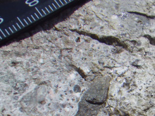 溶結構造が明瞭で、石英・斜長石(白色)・カリ長石(ピンク色)の結晶片をふくんだ溶結火山礫凝灰岩である。泥岩・黒色頁岩・チャートなどの異質岩片を多くふくんでいる。
