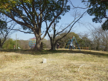 石段を登ると、もう日笠山の山頂だった。クスノキの下が三角点。その向こうは公園になっていて、一組の家族が遊具で遊んでいた。