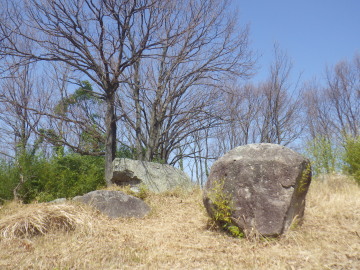 平坦な竹林が続いた。ゆるく下ってひと登りすると、北山のピークに達した。アベマキ林の中に、十数個の岩が載っている。この中の、大きな二つの岩が「夫婦岩」。
