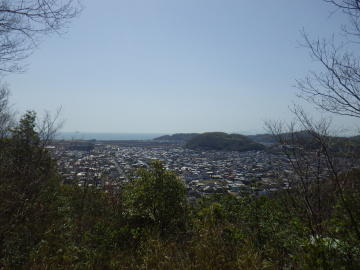 最後のピーク、六本松(91m)は、西に大きく開けていた。眼下に大塩や北浜の街並みが広がり、その向こうを高坪山に連なる山並みが囲んでいる。行基ヶ鼻が海に突き出していた。