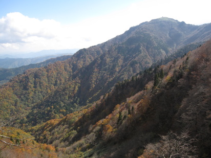 そのコブだらけの岩を回り込んでみると、そこから東は絶壁になって切れ落ち、その先に氷ノ山が見事な形でそびえていた。山頂からほとんど直線的に急角度で下りる稜線。山体に刻まれた深く険しい谷。そして、山全体が紅葉に染まっていた。