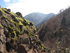 少し下ったところに、「天狗岩」の標識が立っていた。ここから、谷のすぐ向こうの赤倉山北面に飛び出した天狗岩がよく見えた。天狗岩は、ほとんど垂直に切れ落ちた大きな露岩。黒い安山岩からできているが、表面が蘚苔類におおわれて白く見えた。