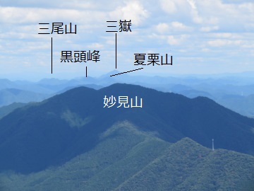 妙見山の右手には、幾重にも山並みが重なっていた。空は層積雲におおわれていたが、視程の良い日だった。遠くの山ほど青くて淡い。いちばん遠くに、京都の地蔵山から愛宕山への稜線が浮かんでいた。