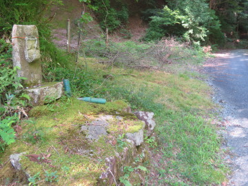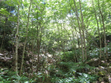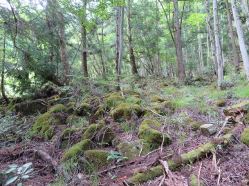谷はガレ石で埋まっていて、その中に峠道は消えた。ガレ石の上は歩きにくいので、右のスギ林にもぐりこんだ。