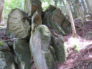 | 岩屋から大屋峠への峠道は、途中で消える。谷を埋めるガレ石の上を、ヤブを分け、倒木を乗り越えて登っていった。 大屋峠から入相山山頂を経て662mピーク前のコルまでは、尾根道が続いている。コルから、沢に沿って下っていくが、途中ガレ石の中に道が消えているところがある。 高坂峠に置いていた自転車で、賽の神の大岩へ戻った。 |