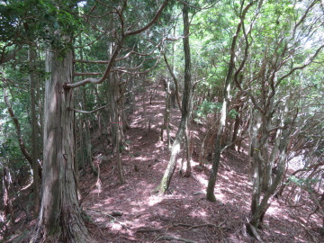 峠で時間をとってゆっくりと休んだ。十分に給水し、おにぎりを食べる。ここからは、尾根に広い道がついていた。