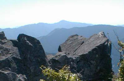 一等三角点のある頂上は、多くの人で賑わっていた。頂上のアケボノツツジは、その豪華な花をまだつけていた。七種の山々、明神山、暁晴山、段ヶ峰、千が峰……どの山も、今日は白く霞んでいる。山頂を北東に少し降りたところに突き出た「天狗岩」を見て、再び山頂へ。わずかの間に、また人が増えていた。ササを漕いで、「天邪鬼(あまのじゃく)の挽岩」を探したが見つけることはできなかった。