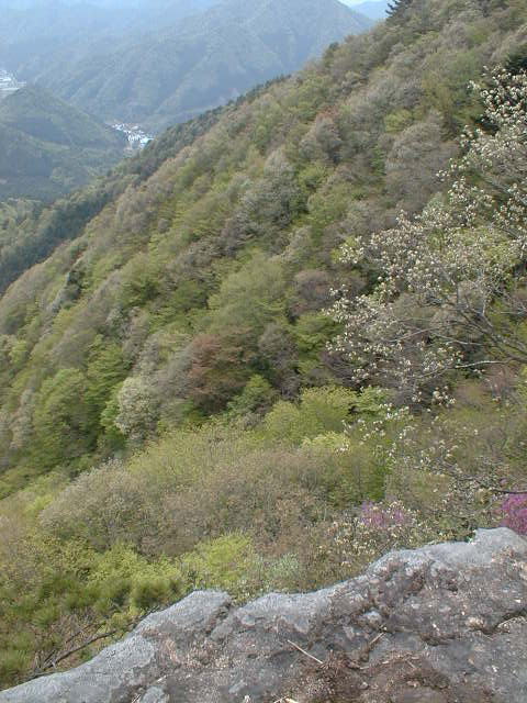 下山の途中に、「蓬莱岩」に寄る。蓬莱岩まで20mとの道標に従って岩がちの斜面を下りていくと、山の斜面に突き出た巨岩の上に出た。岩の上はほぼ水平、畳三畳ほどの広さがある。下を見下ろすと、ほぼ垂直に落ちている。高さは20〜30mもあるだろうか。誰もいないこの蓬莱岩の上に立った。高い……!。左右の山の斜面には、自然林が広がっている。萌葱色、若草色、若葉色、薄オレンジ色……山はまだらに染まっている。どの色も初々しい春の色である。、下には、畝のように連なる低い山々とその間を縫って流れる川。その先に広がる南播磨の土地は、茫洋として白く霞んでいる。斜面の下からは、気持ちの良い風が吹き上げてきた。麓の村の田を渡り、新緑の山の斜面を駆け登ってきた風である。私は、その風を2、3度、思い切り吸い込んだ。