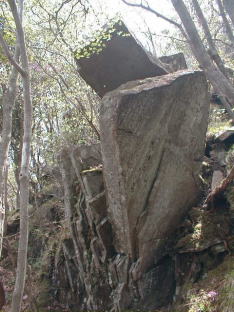 山頂の周辺に、「天狗岩」と「天邪鬼の挽岩」がある。東に千が峰縦走コースを少し降り、「天狗岩」の道標に従って縦走コースから北に踏み跡を辿ると「天狗岩」があった。雑木の中で、全貌をつかみにくいが、この岩は笠形山の岩石の特徴をよく教えてくれる。山頂に登り返して、今度は「天邪鬼の挽岩」を探す。山頂に憩う多くの人たちの目を少し気にしながら、方向の見当をつけてササのヤブの中に分け入った。見つからない。もう一度、山頂に出て別の方向に入る。分からなかった。次回の楽しみにとっておくことにする。