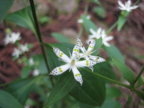 とこどき差す陽が、黄色に染まり始めた雑木の葉を浮かび上がらせた。深く積もる落ち葉の間に、シコクママコナがピンクの小さな花をつけていた。