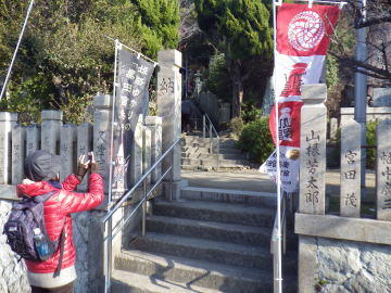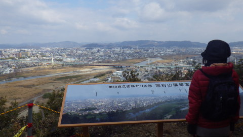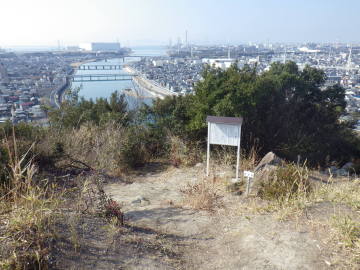 | 荒神社の下に車を止め、神社から山頂へ向かった。山頂部には、ぐるりと城跡を一周できる道が整備されている。山頂には丸いコンクリート製の椅子が置かれ、大きな写真による案内板が設けられていた。 黒田職隆廟と母里太兵衛生誕の地記念碑は、妻鹿の街の中にある。荒神社から、歩いて10分くらいである。 |