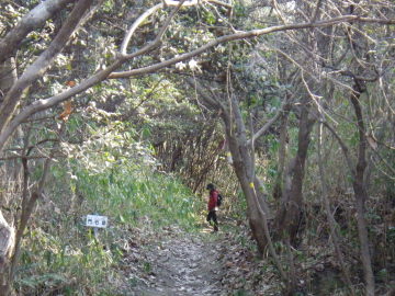 神社から、山道に入った。冬枯れの雑木林に、ヒサカキやマメツゲ、アオキが緑の葉をつけている。ところどころにシュロが立っていた。 道はよく整備され、林内には柔らかな木漏れ日が降り注いでいた。 道はつづらになり、城の遺構が現れ始めた。石で囲まれた「井戸跡」のくぼみには、落ち葉の上に水がたまっていた。 道が平らになると、「門石跡」。次の「かまど跡」の標識に沿って左に折れると、枝を大きく広げたモチノキが立ち、その下に7,8個の石が丸く並べられていた。