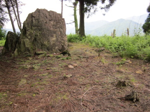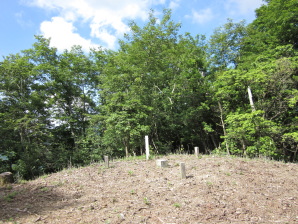 標高540mの地点にも小さな曲輪跡があった。さらに登って590mを越えると、広い台地状の平地に出た。平地の端に、「二の曲輪」と書かれた白い標柱が立っていた。