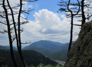 15時ちょうどに、釜床山の山頂に達した。山頂は広く開かれ、セミの声が大きかった。広場の周りは、コナラ、アセビ、ネジキ、ホウノキなどの自然林。それらの木陰に入ると、木漏れ日もまばらで涼しかった。