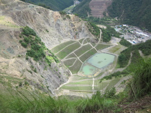 雑木を抜けると、足元からまっ逆さまに麓まで落ちる絶壁に行き当たった。大規模な採石がなされ、山の南側がここまで大きくえぐり取られていた。下をのぞき込むと、真下に沈殿池がある。その向こうに工場の建物が並び、3つの丸い沈殿槽が緑色の水を張っていた。