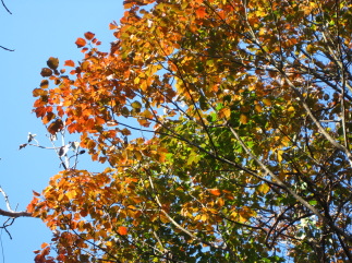 カマツカの葉がオレンジ色に染まっている。タカノツメの黄葉が際立っていた。汗ばんできた体に、樹間を抜けて吹き上げてくる風が心地よかった。
