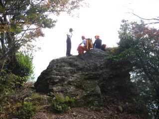 419mの肩で一休みした。コハウチワカエデやウリハダカエデの紅葉が、青空をバックに美しい。コゲラが、木を上りながら幹をつついていた。鳥の声を聞こうと耳を澄ましていると、山陰線を走る電車の音が小さく聞こえてきた。