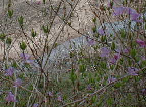 雑木林の落葉樹は、まだ小さな初々しい葉を出している。イロハカエデは、鮮やかな透き通った萌黄色(もえぎいろ)。コナラの葉はまだ小さく閉じて裏葉柳(うらばやなぎ)。花の散ったヤマザクラは浅蘇芳(あさすおう)。コバノミツバツツジは若葉色(わかばいろ)。まだまだ、いろいろな新緑の色。新緑色に多くの名があるのを知ったのは、このすぐ西の「神戸市立森林植物公園」に昨年行ったときのことであった。クスノキやカシやシイなどの常緑広葉樹も古い葉を落とし、新しい葉を開き始めている。これに、ツガ・スギなどの針葉樹の濃い緑が混じり、またところどころにはカスミザクラやタムシバの白い花やミツバツツジの薄紫の花が色を添えている。山は、春のまだらに染まっていた。
