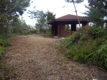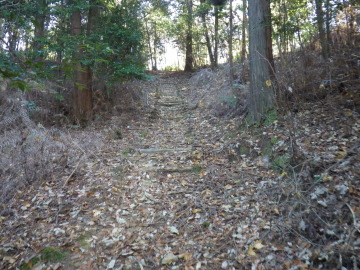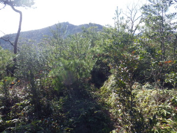 | 周世八幡神社に自転車をデポし、有年横尾登山口から山に入った。三重山、験行寺、高雄山と結ぶ今回歩いたコースは、「赤穂ふれあいの森」として遊歩道がつけられ、要所に道標や東屋、ベンチなどが備えられている。 道は全体としてよく整備されていたが、川向山山頂をめざす道に入るには、ちょっとした覚悟が必要である。 高雄山と179.4mピークの間のコルからは、西へ表参道、東へ裏参道が下っている。今回は、裏参道から周世の集落へ下った。 |
