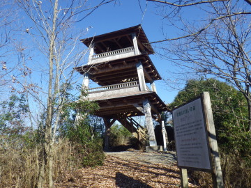 この尾根道を北へゆるく登ると、三層の大展望台が建っていた。三重山の山頂である。城跡を意識して建てられたのか、本物の砦のような立派な展望台。展望台に登ると、あたりをぐるりと見渡すことができた。