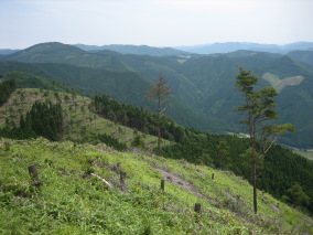 標高880m地点は南側が伐採されていて、染河内川を隔てた山並みが一望できた。その山並みの稜線を送電線がほとんど真っ直ぐに伸びていた。