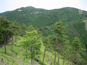 土手の上は、もう歩けなくなった。土手を下りて、ヤブの中を進んだ。ヤブはしだいに深くなり、ササやアセビ・ツツジの細い幹が体にからんだ。頭から倒れ込むように強引に突っ込んだ。やっとの思いでヤブを抜けたところが、暁晴山の山頂だった。