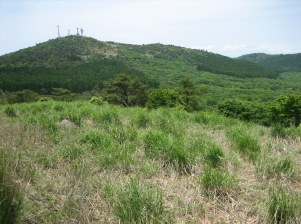 電波塔の林立する暁晴山を見ながら急坂を下り、上り返すと951mピークに達した。展望の良いピークであった。北に峰山高原の南側を縁どる丘が見え、丸く飛び出した夜鷹山の右には太田池をのせた高原が広がっていた。