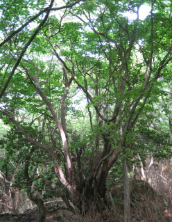 黒土の湿った小さなコルを過ぎて上り返すと、きれいに整備された道に出た。この道を横切り、再び町界尾根にもぐりこんだ。町界には、まだ土手が続いていた。土手の高さは2mほど。ところどころ、シカが通り道として使っているのか低くなっていた。根元から何本もの幹に分かれた古くて大きなリョウブが立っていた。