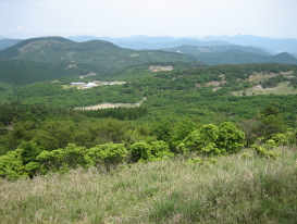 眼下には、侵食から取り残されたいくつかの残丘の中に峰山高原が広がっている。中央部には新しいホテル。高原を歩けば、幾本かの岩塊流を目にすることができるだろう。