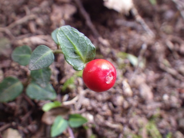 ツルアリドオシの実は、少し変わっている。2個の花から1つの実ができるので、実には2つの花跡があった。