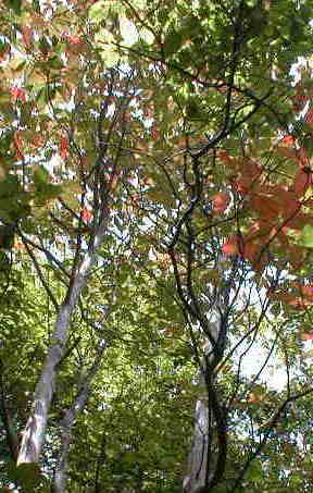 チャートの岩塊が階段状になった小径を上っていくと、すぐに二つ目の休憩所。壁に落書きが多く、見苦しい。層状チャートより成る大きな岩に掘られた祠に立つ地蔵さんを左手に見て上っていくと、二股(標高300m)に達する。右の沢をコルをめざして上っていくが、ここから自然林となった。「丹波自然友の会」による標札が、ところどころに掛かっているのが嬉しい。まだ青い小さな実を付けたヒサカキ、光沢のある全縁の葉をもつソヨゴ、紅葉が始まった鹿子模様の幹のリョウブ、それにアベマキ、ヤブツバキ、コナラ、ネジキ、ナツハゼ、ヒカゲツツジ、モチツツジ、ベニドウダンツツジ、細長い葉のヤダケ等々……。コルまでは短い上りだが、木を見ていると時間はどんどん過ぎていった。