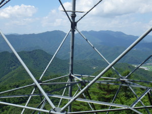 ヒルとの闘いは続いていた。地面で頭をもたげ、ぐにゃぐにゃとその頭を回して靴に張り付いてくる。木の上から落ちてきたヒルは、肩の上で動いていた。「高野聖」の中の世界・・・。見つけては、はじき落とした。 ヒルを少しでも避けるために、立ち止まるわけにはいかなかった。イヌシデや、ハリギリの大きな木が立っていた。クロツグミやイカルが鳴いていた。 急坂を登ると東西尾根に合流した。西に少しだけ寄り道して、送電線鉄塔下に出た。ここなら、日当たりが良い草地で、つかの間ヒルから避難できる。 眼下に、和田山の町。その向こうに竹田城址が低い。大倉部山が稜線を斜めにせり上げ、須留ヶ峰が山頂部を波打たせていた。
