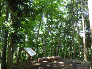 男山へ0.1kmの分岐があった。男山は、南へ分枝した支尾根上の小さなコブ。人工林とヤブツバキやヤマモミジなどの雑木林の間に丸く開け、丸太のベンチが一つ置かれていた。