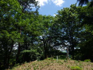 山頂を後にして、東へ続く切り開きを進んだ。台形の上底にあたる室尾山の山頂部。下から見上げた山形どおり、長く平坦な道だった。クリの花穂がたくさん落ちていた。クロツグミが大きな声でさえずった。