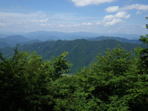 山頂は北西に開けていた。山々は、遠くになるほど白く青くなって幾重にも重なっていた。スカイラインは、三川山・蘇武岳・妙見山と続く但馬中央稜。その南に、鉢伏山や氷ノ山が連なっていた。