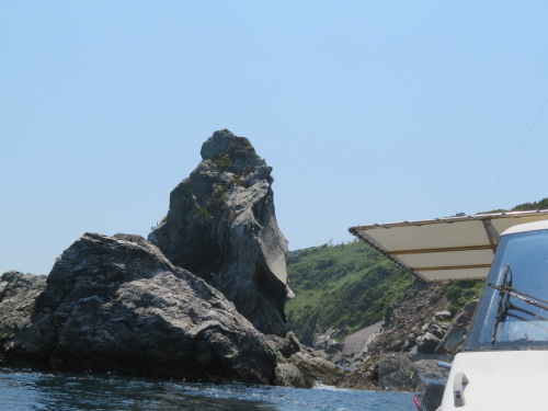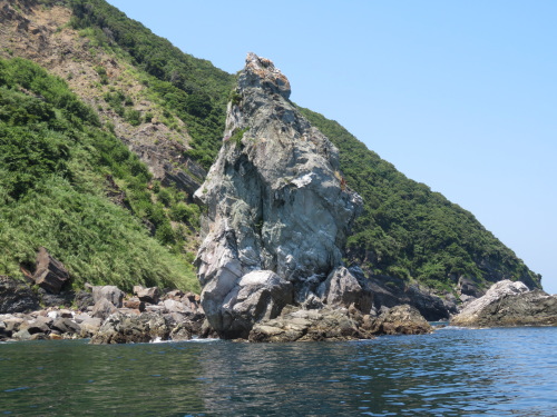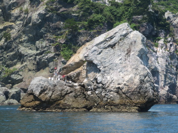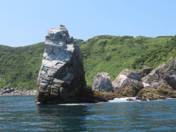 このあたりは、大小の岩礁が海面に顔を出しています。その中でひときわ大きいのが下立神岩です。岩の上には釣師が一人。どうやってそんなところに立てているの? 下立神岩は、かつては上立神岩よりも高かったのですが、1854年の安政大地震により中ほどから折れたと伝えられています。折れた岩が下の岩にかぶさって中心部に穴の開く珍しい形になりましたが、1934年(昭和9)の室戸台風によって上にかぶさった岩もくずれ落ちてしまいました。 船が下立神岩の横を通り過ぎると、岩の姿は先のとがった岩塔となりました。その下には、崩れ落ちた部分が海の上に顔を出しています。釣り人がもう一人、この岩の上で寝ていました。