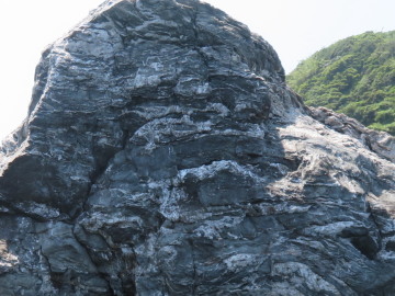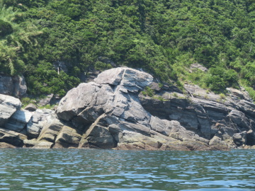 4.さや状褶曲へ 海岸には緑色片岩主体の地層が続きます。猩々(しょうじょう)バエや殿飛(とのとび)と呼ばれている岩を見ながら進むと、入江がありました。薬師浦です。 昔、沼島で疫病が流行したとき、島を訪れた一人の僧がここに生えていた薬草で島民を救ったという言い伝えがあって、この名がつけられたそうです。