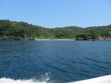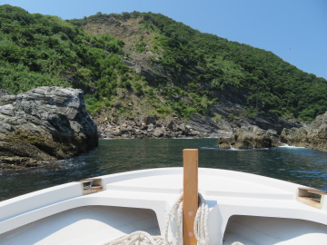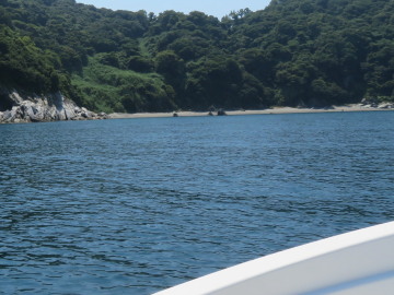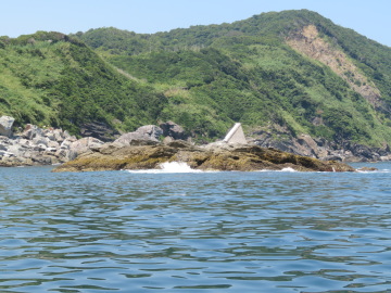 3.上立神岩へ 港を出ても波はほとんどなく、すべるように船は進んでいきます。こんなに海の静かな日は1年に何日もないと小野山さん。 島の周囲は切り立った海食崖で、北に30°ほど傾いた泥質片岩の地層が続きます。その海食崖が途切れたところが入江になっていて、そこに砂浜が見えました。古水浦です。 ここから縄文時代などの製塩土器が見つかっています。その中の棒状の土器は、海の水を煮詰めるときの突沸を防ぐために使われたことがわかっているそうです。