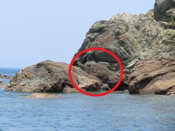 船は、島最北端の黒崎の沖に達すると陸にどんどん近づいていきました。もうこれ以上近づけないところで、船は止まりました。船の先、海面よりわずかに高いところに見えるのが「さや状褶曲」です! 周囲は緑色片岩ですが、その中に茶色に見える岩石がはさまれています。この岩石は、泥質成分をふくむ石英片岩(前川ほか 2024)で、そこにさや状褶曲が現れているのです。