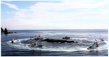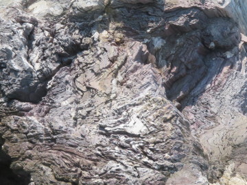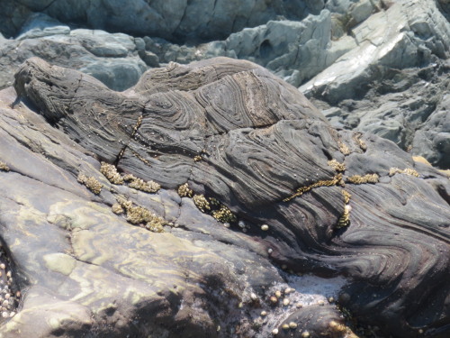 さや状褶曲とは、刀の鞘(さや)のような形をした褶曲で、その断面は同心円状の縞模様になります。船から見えるのはこの断面で、いくつかのさやが重なったようすが観察できます。 さや状褶曲は、この露頭周辺に多数ありますが(前川ほか 2001)、これがもっとも良くさや状褶曲の特徴が認められる露頭です。発見されて30年以上たちますが、発見当時とほとんど変わらずに見事な同心円状の縞模様をなしていました。