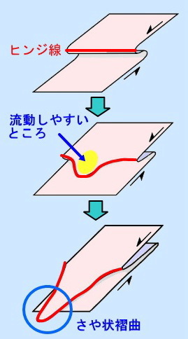 双眼鏡で観察し、写真を撮って船長さんにOKの合図をすると、船は再び動き出しました。 ガイドの小野山さんの話に耳を傾けます。クルーズには、自然の好きな人、地質や鳥類の研究者、ハモを食べに来て船に乗った人・・・といろいろいるそうで、客に合わせて話を選んでいるということです。ちがう話で島を三周はできるそうです。 約50分のクルーズを終え、船は浮き桟橋へ帰っていきました。 5.さや(鞘)状褶曲のでき方 沼島でさや状褶曲が見つかったのは、1994年のことです。3年後の、1997年12月18日の神戸新聞に「1億年の地球のしわ」というタイトルで初めて紹介されました。正式に論文として発表されたのは、2001年のことです (前川ほか 2001)。 さや状褶曲は、“Sheath fold”の日本語訳で、シース褶曲、さや型褶曲、さや褶曲とも呼ばれます。 さや状褶曲が初めて報告されたのはフランス、ブルターニュ地方のグロワ島です(Quinquis et al 1978)。その後、イタリア、スウェーデン、台湾、日本、オーストラリア、アパラチア、カナダなど世界各地から報告されています。日本は、沼島以外に四国中央部や長崎などの数ヶ所です。しかし3次元的に観察できない場合は誤認の可能性もあり、3次元的に観察できる沼島は確実で貴重なのです(前川ほか 2001)。 このさや状褶曲は今から約9000万年前、沼島が深さ約30kmのプレート沈み込み帯にあったころにプレートの運動によってつくられらものと考えられています。沈み込んだ地層に強いずれ(剪断)応力が加わって地層がゆがみ生まれたのです。 褶曲で曲率が最大となる点をヒンジといいます。そのヒンジを結んだ線をヒンジ線といいます。地層をつくっている岩石には、硬くて形の変わりにくいところと、軟らかくて流動しやすいところがあります。 さや状褶曲は、地層に強い力が加わって岩石の流動化しやすい部分が引き伸ばされ、ヒンジ線が著しく曲がってさやのような形になったと考えられます(下図)。その断面は、同心円状の構造となります。