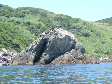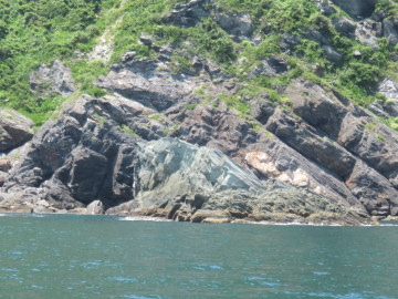 中瀬ノ鼻を回り込むと、船は外海に出ます。この海域は、南に紀伊水道があってその先には太平洋が広がっています。北西の鳴門海峡の向こうには播磨灘、北東の友ヶ島水道の向こうには大阪湾があって、沼島は海路の要衝であることがわかります。沼島は昔から海人の島だったのです。 黒い泥質片岩の中のところどころに、緑色の岩がはさまれています。緑色の大きな三角形の岩には、ずばり青磯という名前がついていました。