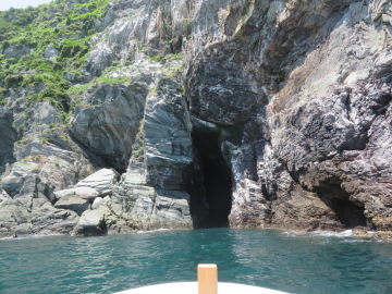しばらく進んだあと、船は船先を陸に向けて断崖に近づいていきました。縦長の四角い穴が開いています。穴の奥は暗くてどれくらい深いかわかりません。穴口と呼ばれているこの穴は、黄泉(よみ)に国に続いているといわれているそうです。