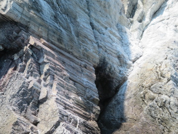 穴口の前で上を見上げると、高い崖が垂直に迫っています。結晶片岩の大露頭です。目の前に、一方向に割れる片理や片理面の上に発達する線構造、細かい褶曲などが迫力ある岩の光景をつくり出していました。